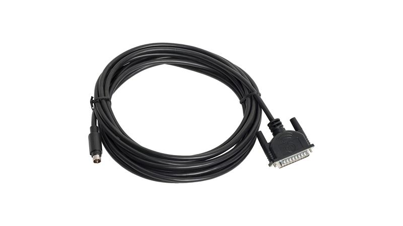 The Schneider Electric Uni-Telway/Modbus serial link connecting cable is 5 m long with one male mini DIN and one male SUB-D 25 connector._x000D_