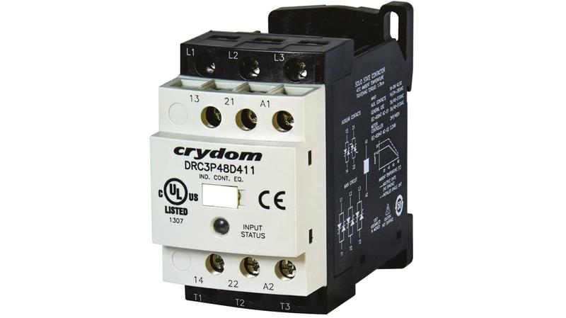 Crydom DRC Series Solid State Contactors_x000D_ Crydom DRC Series Solid State Contactors are intended for frequently switching on and off three phase loads up to 5 HP. They are available in both contactor versions DRC3P and reversing contactor versions DRC3R._x000D_ DRC3P are available in either instantaneous turn-on (for Motor Control) or zero voltage turn-on (for Resistive Loads)._x000D_ DRC3R include an interlock control that allows only off, forward and reverse operation in a safe mode: they switch_x000D_ instantaneously upon application of the control voltage and when an instantaneous change of direction is commanded they will delay the direction change by 100m/sec in order to prevent simultaneous forward and reverse operations._x000D_ This unique solid state contactor can start/stop a 3 Phase AC Motor at a maximum switching frequency of 9000 cycles/hour._x000D_ 7.6 Amp Motor Controller rated Solid State Contactor_x000D_ Load voltage range up to 530 VAC_x000D_ Fits standard 35 mm DIN rail_x000D_ LED input status indicator_x000D_ AC or DC control_x000D_ Zero crossing (resistive loads) or instantaneous turn-on (inductive loads) output_x000D_ Built in Overvoltage Protection_x000D_ Ultra-efficient thermal management design (Patented)_x000D_ C-UL-US Listed, IEC Rated, CE & RoHS Compliant, Horsepower Rated_x000D_ Embedded auxiliary contacts_x000D_ DRC3R has reversing control (DRC3R includes On/Off and Forward/Reverse control in a compact 45 mm package)_x000D_ Output terminals designed for an easy connection to multiple motor connections in parallel for a total up to 5 HP @ 480 Vac_x000D_ Very low input control current_x000D_ UL Listed, IEC60947-2 standard package_x000D_ Note_x000D_ The reversing option has dual control inputs._x000D_ Solid State Contactors