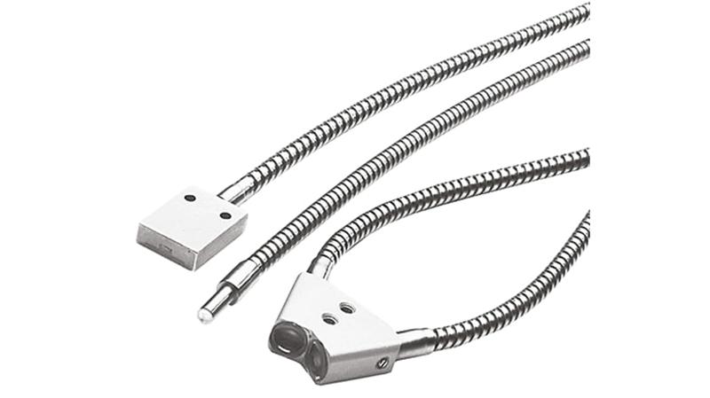 Heavy duty fibre optic sensor module and a choice of through-beam or direct-detect glass fibre optic cables with stainless steel jackets._x000D_