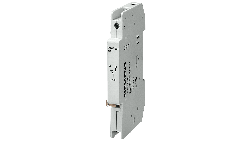 The Siemens SENTRON series auxiliary current switch for cylindrical fuse base has 1 CO auxiliary contacts. It has width of 9mm, height of 83mm and depth of 64mm._x000D_