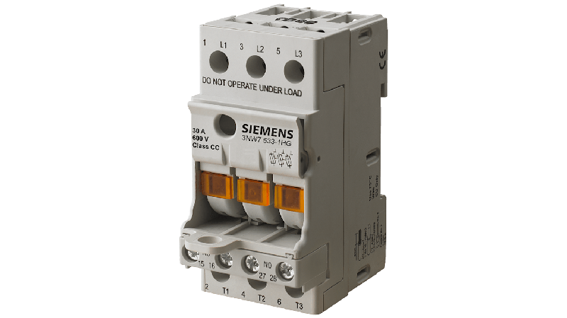 The Siemens SENTRON series auxiliary switch for compact fuse holder has 1NC/1NO auxiliary contacts. It has width of 9mm, height of 83mm and depth of 64mm._x000D_