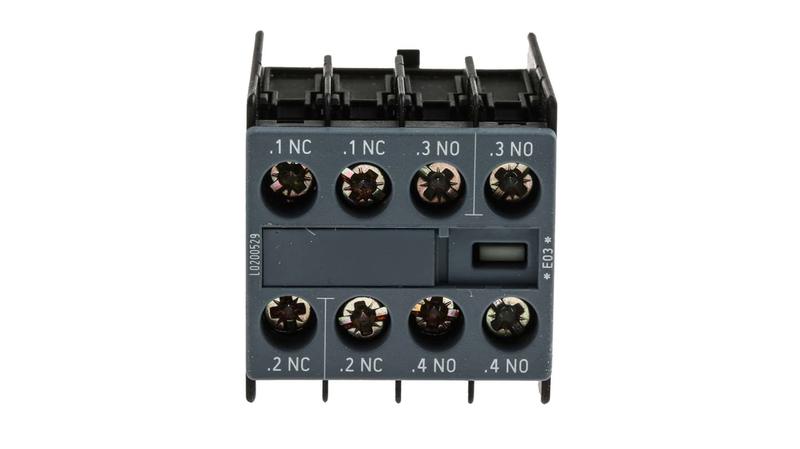 Install this high-performance auxiliary contact from Siemens' SIRIUS Innovation range with your main contactors to increase the amount of electricity that can flow through your system. It's a front-mount electromechanical device with four contacts – two normally closed (NC) and two normally open (NO) – used in conjunction with primary switching equipment such as contactors, circuit breakers, switches and relays. The unit changes states along with your main switches to transmit power signals to logic controllers. This, in turn, activates or deactivates the selected functions of linked devices. You can use this unit with applications such as relay logic circuits, solid-state electronics and electric motors._x000D_