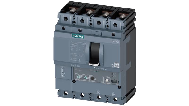 Circuit breaker 3VA2 IEC frame 250 breaking capacity class M Icu=55kA @ 415V 4-pole, LI, In=250A overload protection Ir=100A...250A short-circuit protection Ii=1.5...10 x In N conductor protection adjustable (OFF, 50%, 100%) nut keeper kit