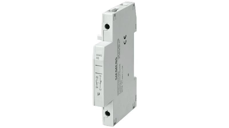 The Siemens SENTRON series auxiliary current switch for residual current operated circuit breaker has 1NC/1NO auxiliary contacts. It has width of 9mm, height of 87mm and depth of 60mm._x000D_