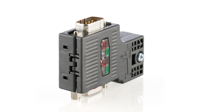 This plug has two connections for PROFIBUS cables. These are made from robust insulation displacement contacts (IDC) that provide full surface contact for excellent conductivity. For connection to terminal equipment, there's a single 9-pin D-sub (D-subminiature) connector that provides highly effective signal transmission.