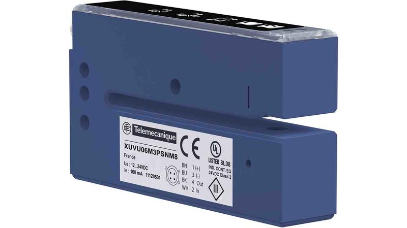 The Schneider Electric This product is part of the XU range, an offer of photoelectric sensors. This ultrasonic sensor has a fork design and a thru-beam detection system. This photoelectric sensor has a numeric potentiometer setting-up, 2 LEDs for output state, adjustment mode and keypad locking. It is an IP65 rated product. The enclosure is made of zinc alloy with PC lens. It is ideal for material handling, packaging, labelling, assembly, lift, escalators or food and beverage industries. It is ideal for detection of transparent labels. This product is certified by CE and CULus._x000D_