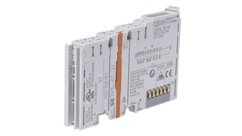The Wago I/O SYSTEM 750 series PLC I/O module has 16 digital channels. It receives binary control signals from digital field devices (e. G., sensors, encoders, switches or proximity switches). Direct insertion of solid conductors is provided by cage clamp terminations. Each input channel has a noise-rejection RC filter with a 3.0ms time constant._x000D_