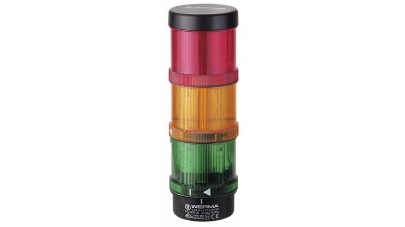 This signal tower from WERMA provides an instant visual alert of potential dangers or hazards. Its continuous light effect ensures that users are notified of machine status or ongoing emergencies at all times. The unit features bright LED (light-emitting diode) bulbs that are easy to see in most lighting conditions. The red, yellow and green lens colours signal an emergency situation, changing process or normal operating status. You can use this signal tower in harsh industrial environments thanks to its wide operating temperature range of -20°C to +50°C._x000D_