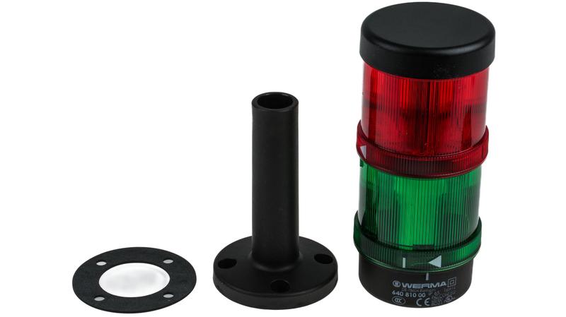 Need a clear and simple visual signalling solution for your industrial work environment? Choose this light-emitting diode (LED) signal tower from WERMA. It has two distinct signal colours – red to indicate an issue on the machine and green to show that it's running properly. This makes it easy for the operator to identify the machine status at a glance. The signal tower's spring-type terminals make installation fast and simple. It's also energy-efficient thanks to its low current consumption of 30mA. Its compact base diameter of 70mm means it will take up minimal space._x000D_