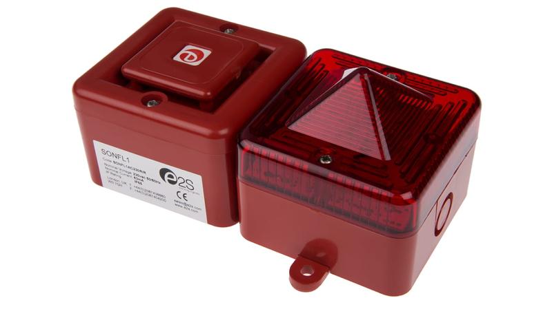 The e2s AC flashy sounder beacon with the red lens has sound level outputs up to 100dB (A) at 1m. This device provides 10 alarm tones options and 2 remotely selectable stages. The alarm horn and Xenon beacon can be connected from a single power supply for simultaneous operation or from separate supplies for independent operation._x000D_
